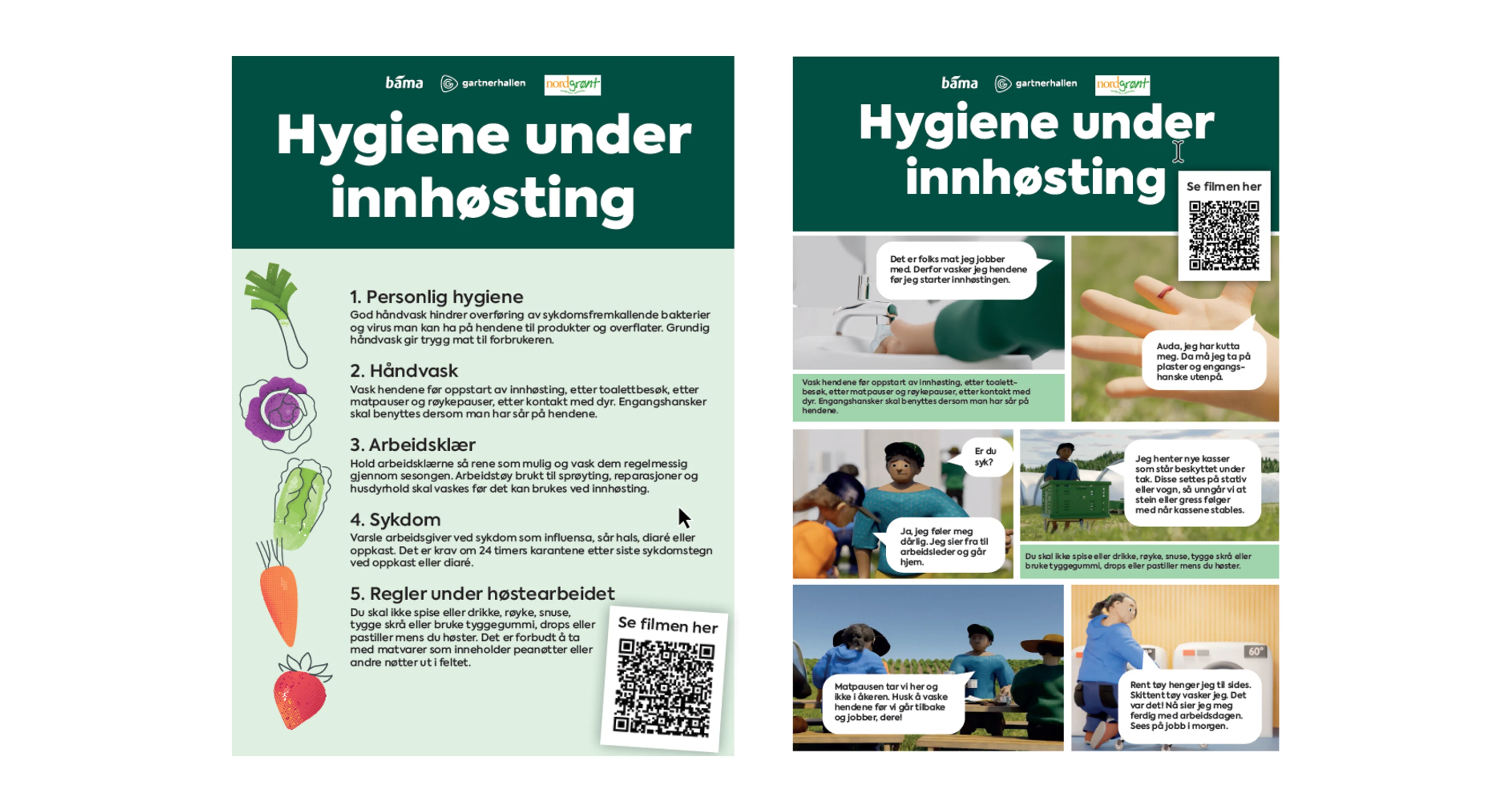 Alle plakatene har en QR-kode som kan brukes til å se en kortfilm som enkelt illustrerer hvilke hygieneregler du som ansatt må kunne under innhøsting.