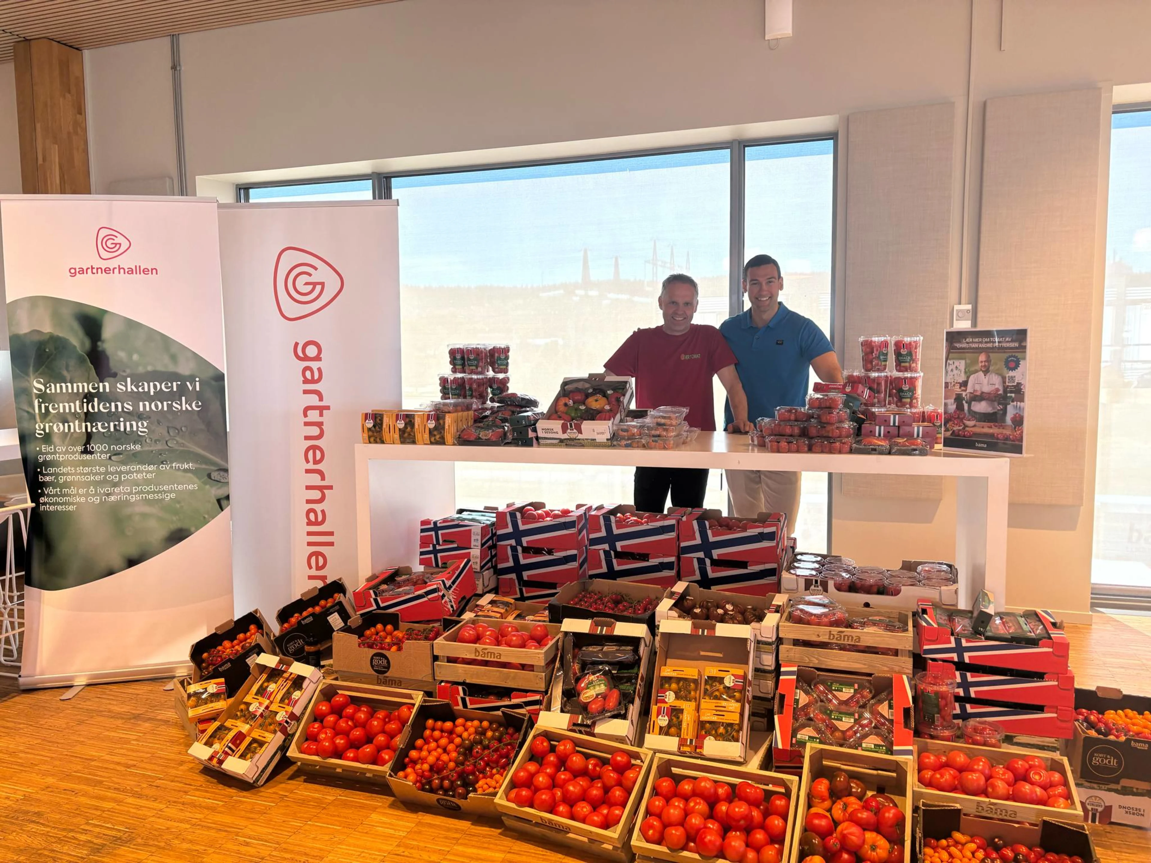 Initiativtakerne for opplegget var Ola Sunde (t.v.) og innkjøper på tomat i BAMA, Alexander Habash Eide, som også stilte opp for anledningen.